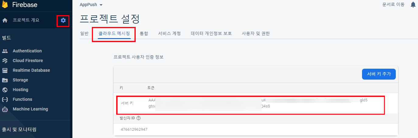 프로젝트 설정 > 클라우드 메시징 탭에서 확인 가능