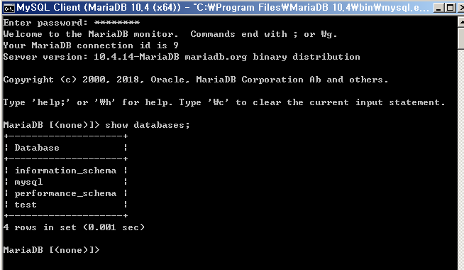 MySQL Client (MariaDB 10.4 (x64)) 를 실행하여 설치시 입력한 "root" 권한 password 를 입력합니다.