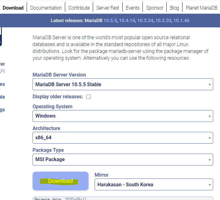 참고로 10.5.5 버전은 windows10 이상부터 설치가 가능하기 떄문에 10.4.x 버전으로 설치를 진행하였습니다.