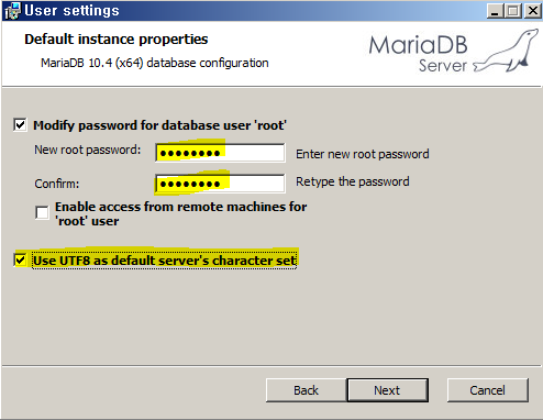 4. root 계정 입력 합니다. 기본 charset을 UTF-8 하려면 check 합니다.