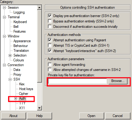 Connection > SSH > Auth 메뉴에서 puttygen 에서 만든 ppk 파일을 선택 후 OPEN