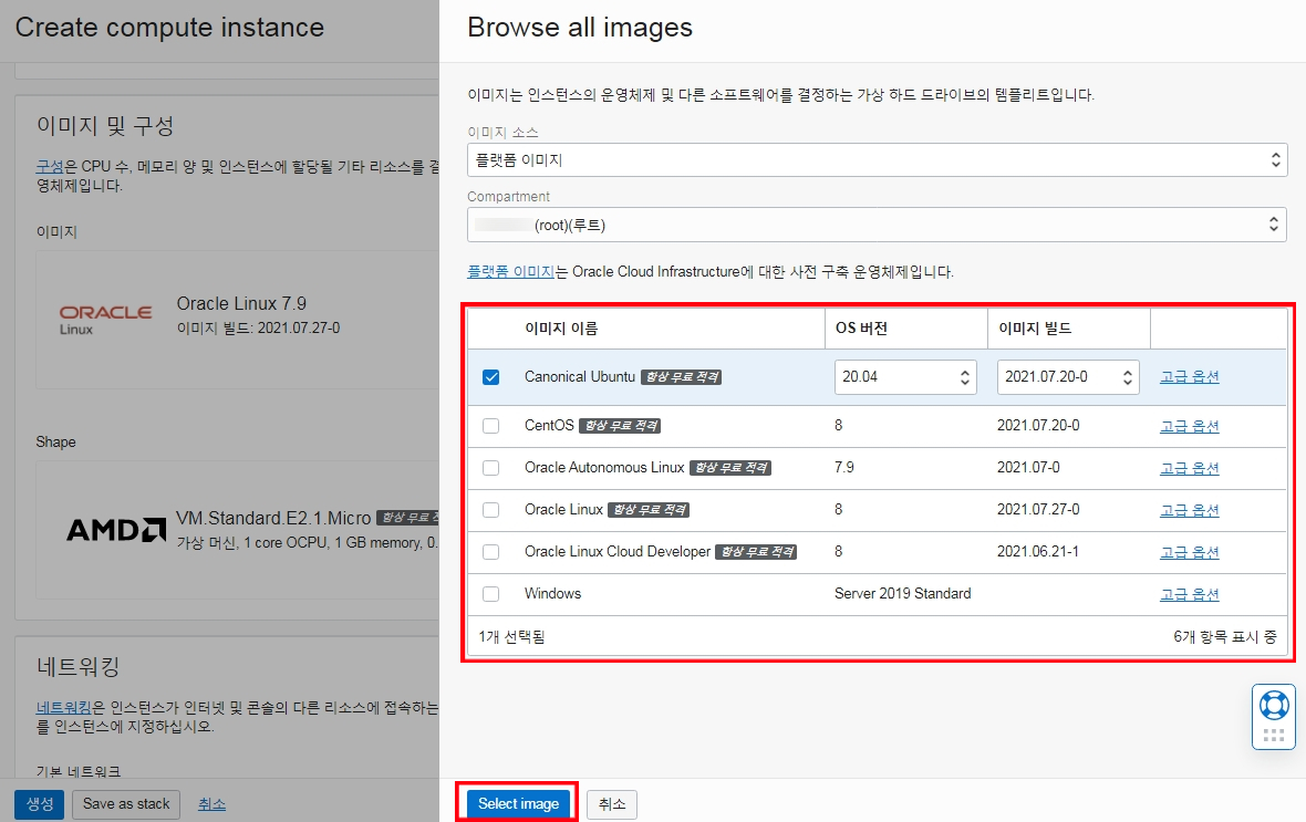 * 여기서는 우분투 20.04 이미지 선택