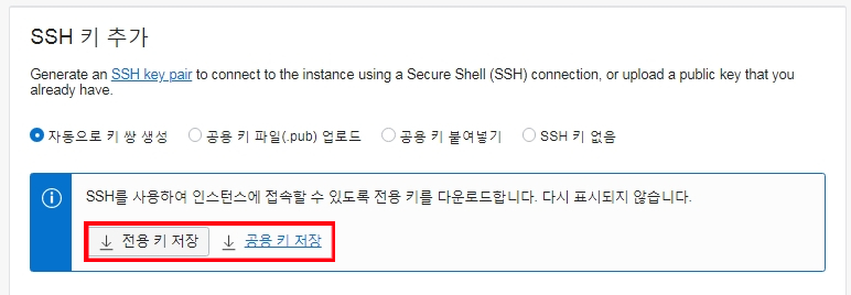 * 전용키, 공용키 저장을 선택하여 키 다운로드 받는다. 서버 접속시 반드시필요.