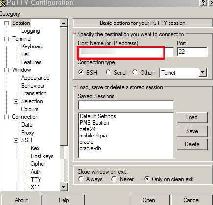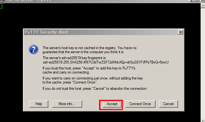 putty 실행 > IP 주소 입력