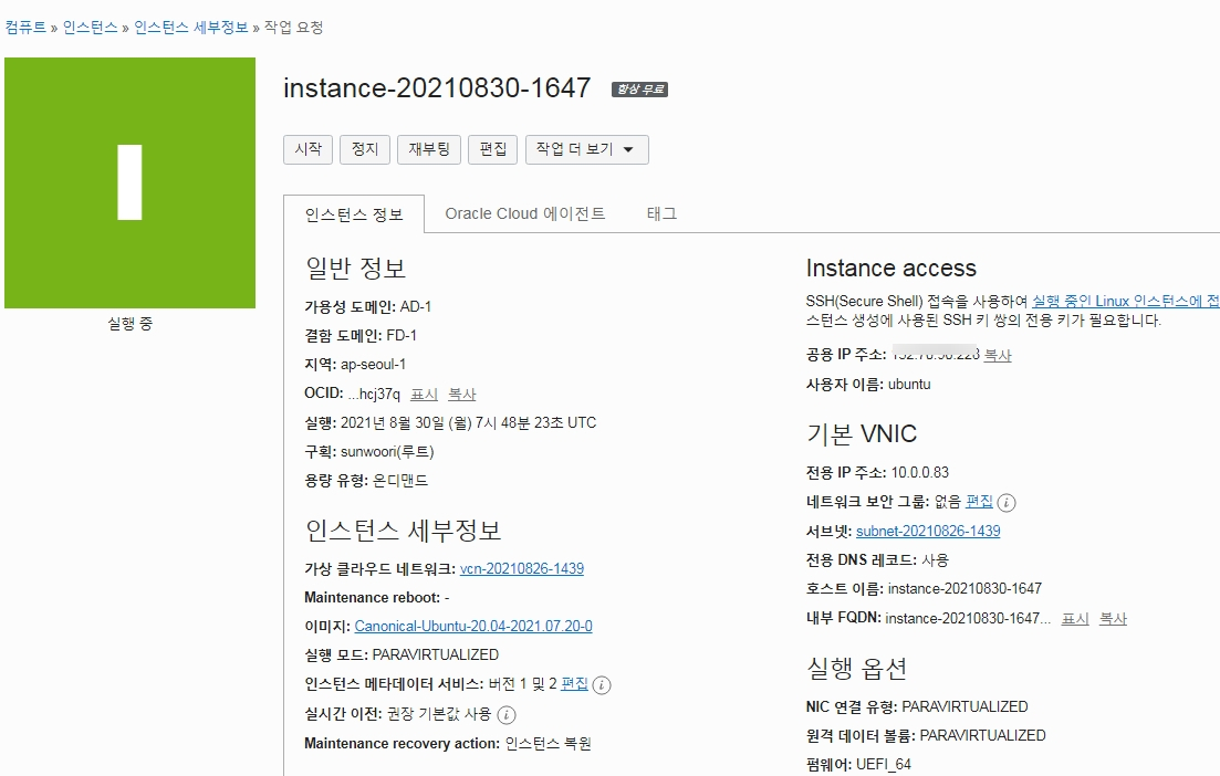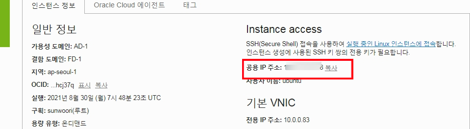 2021.08.30 - [Server/클라우드] - [오라클 클라우드] 공용IP(임시) 전용IP 로 변경하기