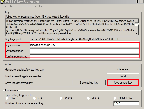 Save private Key 클릭하여 ppk 파일로 저장