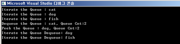 Console.WriteLine($"Dequeue the Queue : {queue.Dequeue()}, Queue Cnt:{queue.Count()}"); // queue 에서 하나 제거