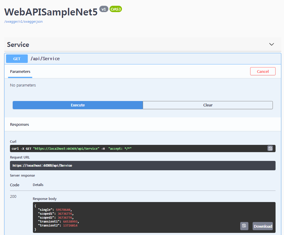 SIngleton, Scoped, Transient 에 따라서 생성되는 인스턴스 의 해쉬값을 확인할수 있습니다.
