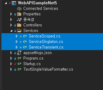 1. 테스트에서 사용할 Singleton, Scoped, Transient 3개의 인터페이스와 구현 클래스를 생성합니다.