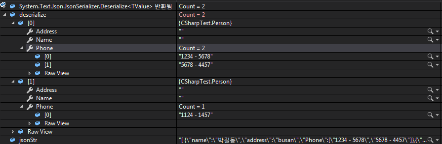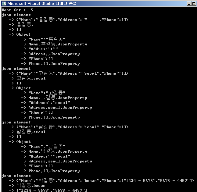 "{\"Name\":\"박길동\",\"Address\":\"busan\",\"Phone\":[\"1234 - 5678\",\"5678 - 4457\"]}," +