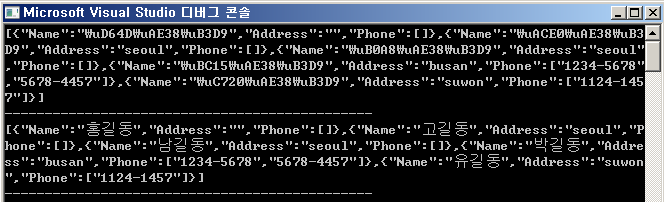 "{\"Name\":\"고길동\",\"Address\":\"seoul\",\"Phone\":[]}," +