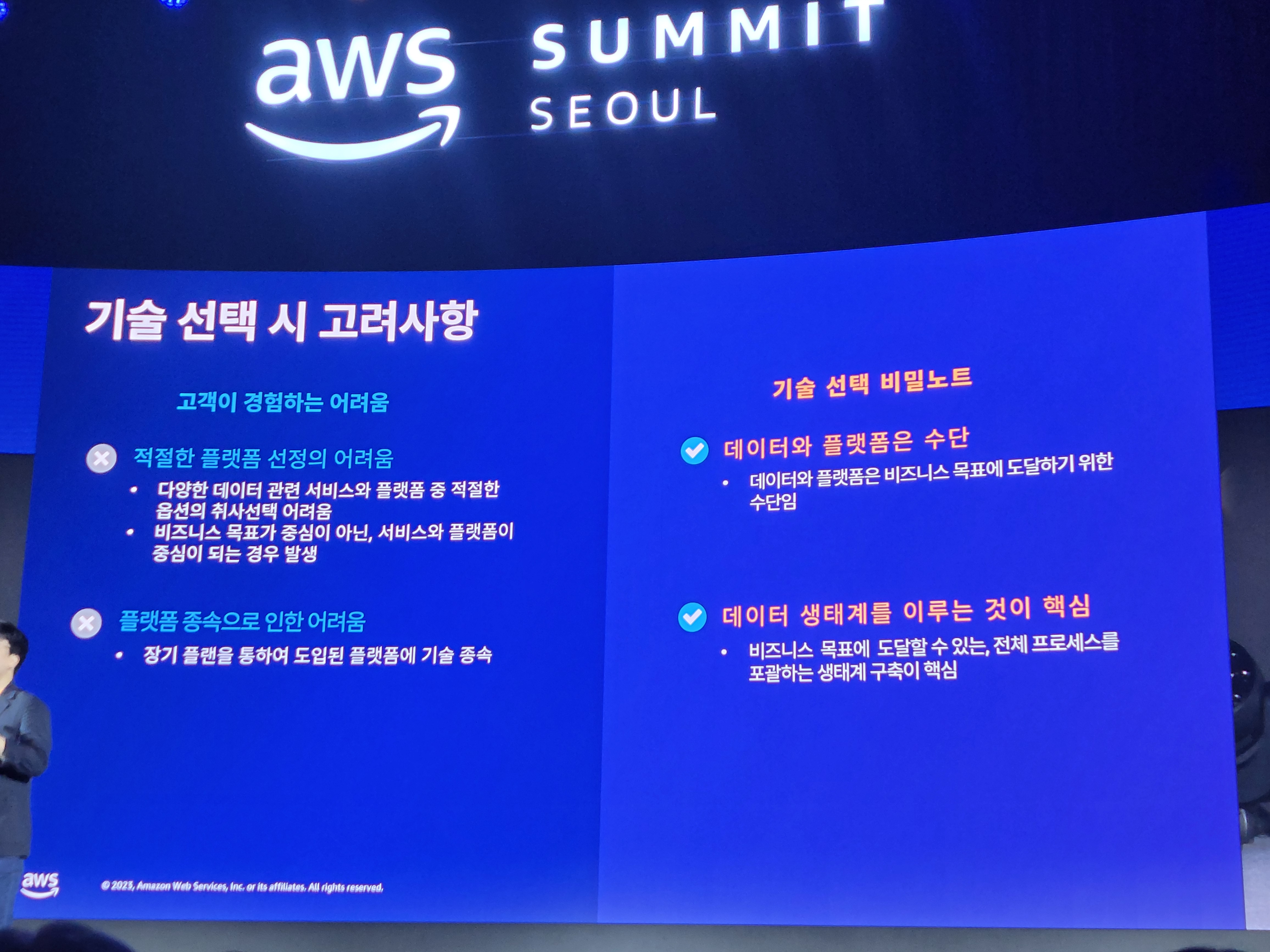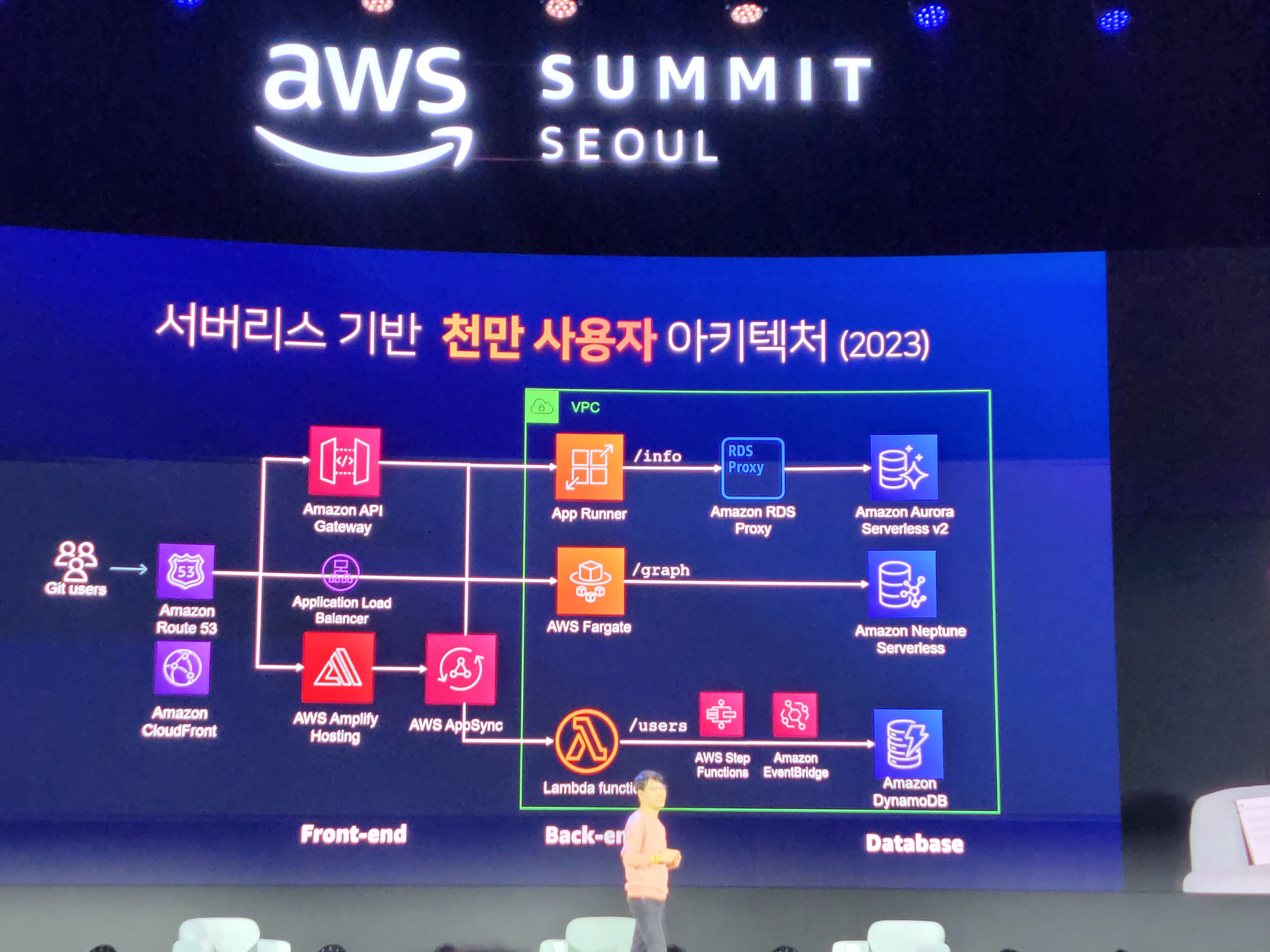 윤석찬 AWS 수석의 진행으로 시작되었으며, AWS 를 통하여 2013년도 인스턴스 기반에서 2023년도 서버리스로 전화되는 과정의 천만 사용자 구축의 아키텍처의 변화에 대한 설명을 주로 하면서 AWS 제품에 대한 간략한 설명으로 시작하였습니다. 이후 현업에서 AWS 리더를 초청하여 질의 응답 시간을 통하여 실제 어떤 상황에서 어떤 제품을 사용하는지에 대한 내용을 들을수 있었던 유익한 시간이었습니다.