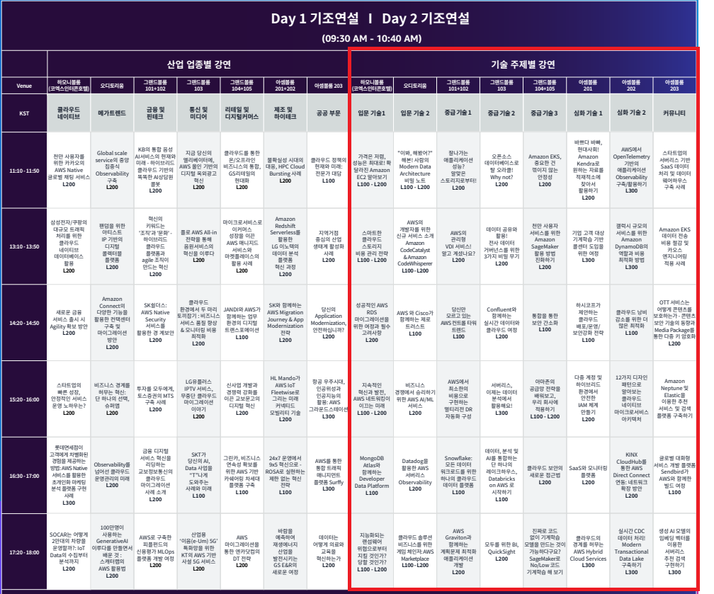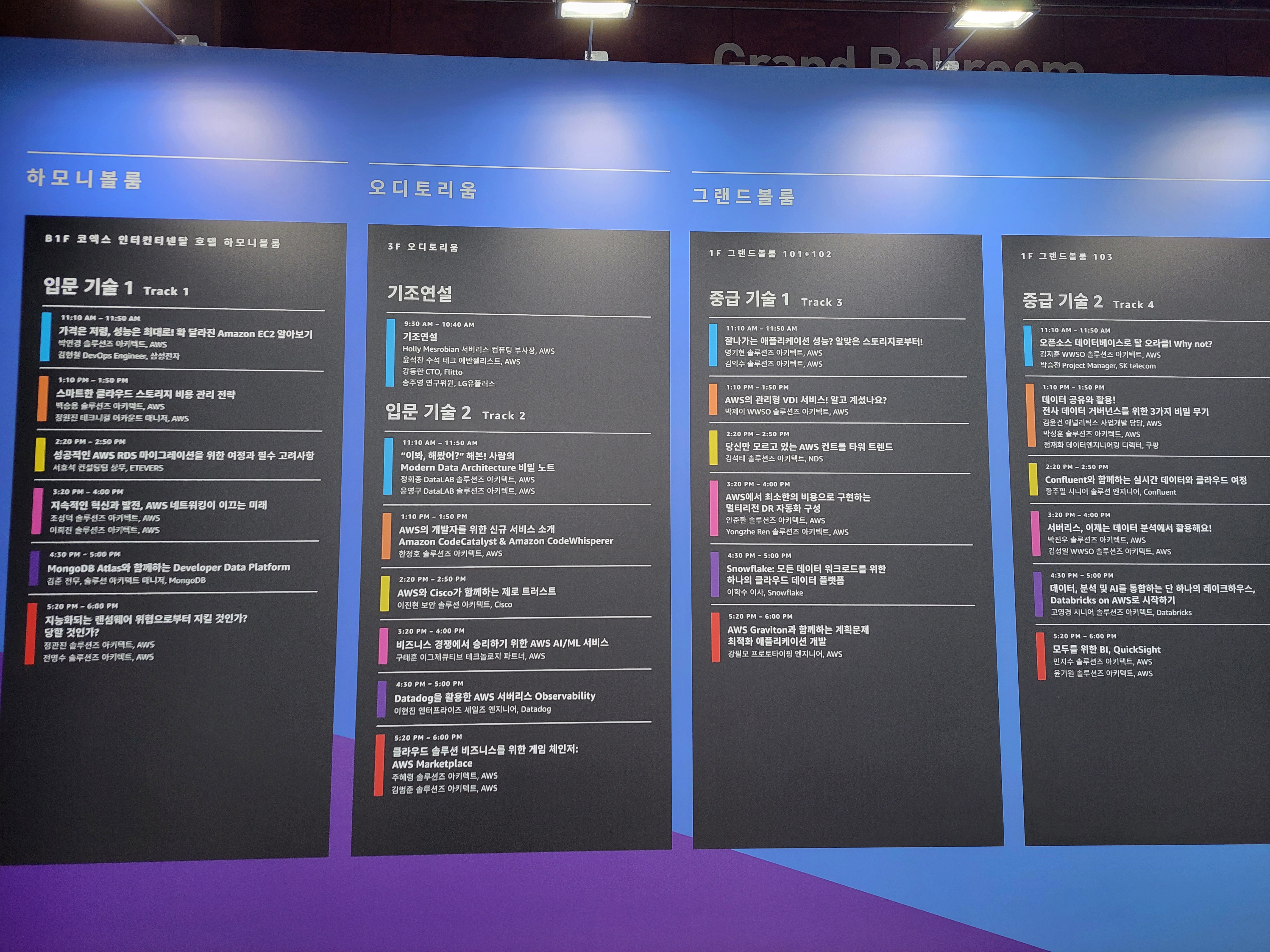 기술 트랙, 실무 경험 공유, 전문가 세션, 토론 패널, 실습 랩 등 다양한 형태의 세션을 포함하여 AWS의 최신 기술과 AWS 서비스에 대한 새로운 기능과 업데이트에 대한 소개를 듣고, AWS의 클라우드 기술과 서비스에 대한 이해를 높이고, 다른 기업과의 경험을 들을 수 있었던 기회였습니다.
