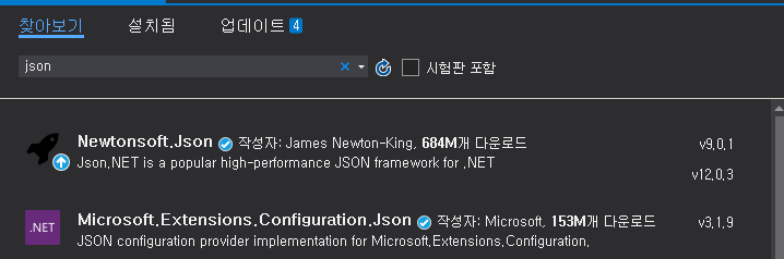 nuget Package 에서 "json" 으로 검색을 해봐도 가장 상위에 나오는것을 볼 수 있습니다.