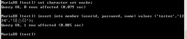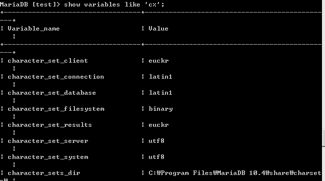 set character set euckr; 을 입력하여 character set 을 euckr 로 변경합니다.