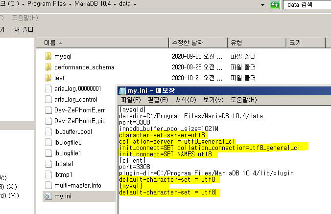 2. mysql 설치된 경로에서 my.ini 파일을 열어서 수정해줍니다.