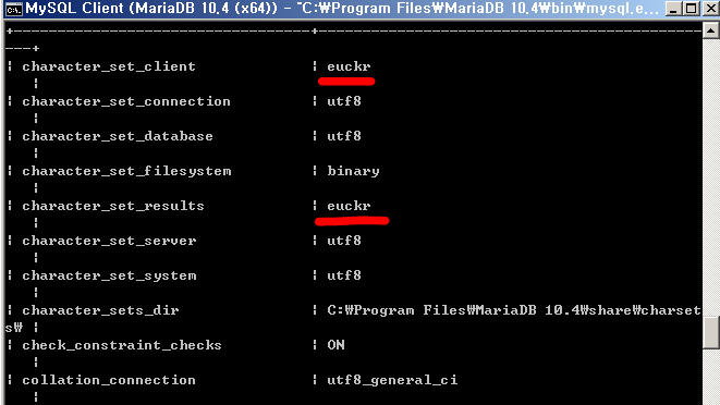 character_set_client 와 character_set_results 가 "euckr" 로 변경된것을 확인 할 수 있습니다.