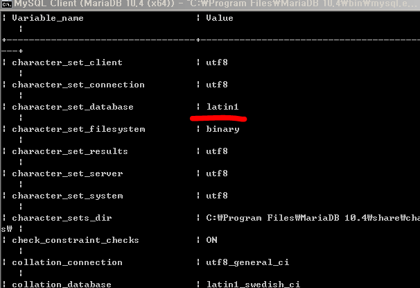mysql 설정 정보를 보면 latin1 로 설정 된것들을 utf8 로 변경하도록 합니다.