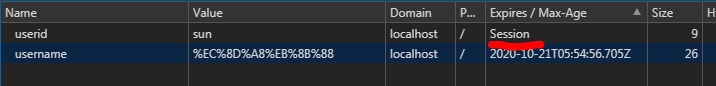 * 쿠키 생성시 maxAge, expires 를 설정하지 않으면 만료시간이 없는 session Cookie가 생성이 된다.