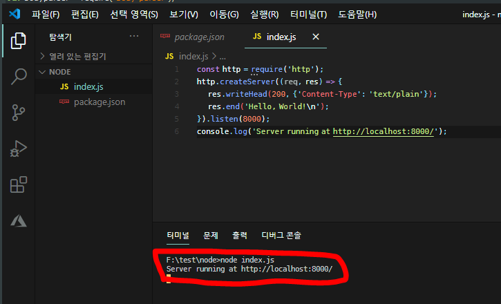 탐색기 NODE 탭에서 "index.js" 파일을 하나 만들어 주고 아래와 같이 코드를 작성 후