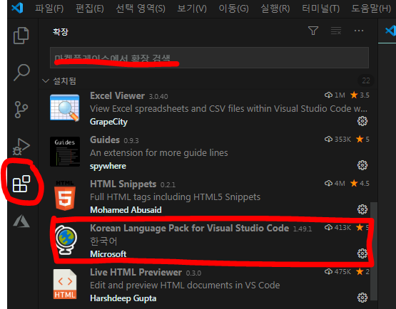 -- 한글 패치를 해줍니다. 아래와 같이 좌측 메뉴 클릭 후 "korean" 입력하시면 한국어 패치 확장 프로그램을 설치 할수 있습니다.