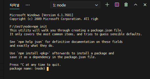 vs code 상단 터미널 선탤 하여 터미널에 "npm init" 입력 후 엔터