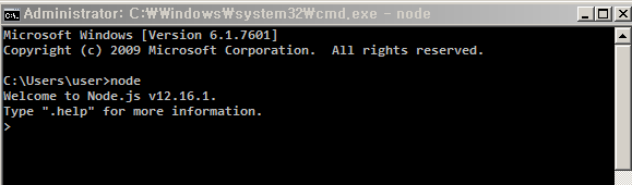 설치가 완료 되었으면 아래와 같이 "node" 를 입력하면설치된 버전이 표시됩니다.