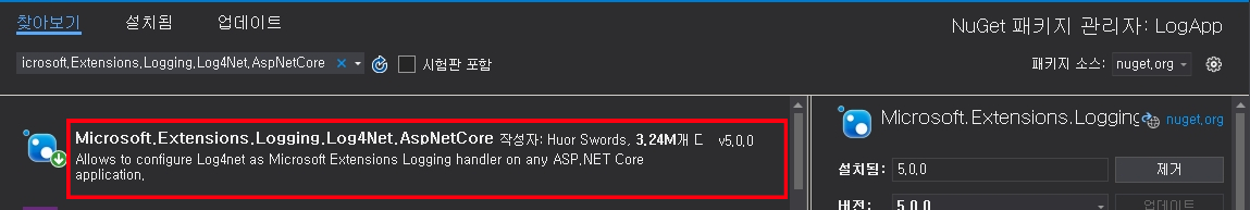 log4net 패키지 모듈 설치 (Microsoft.Extensions.Logging.Log4Net.AspNetCore)