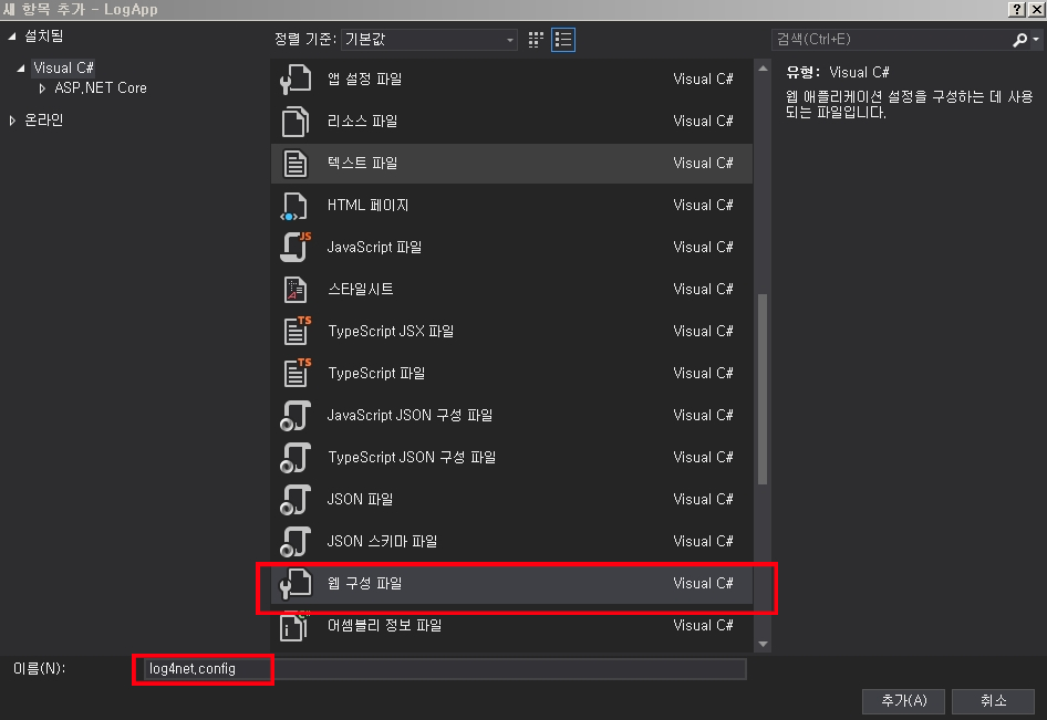 프로젝트 > 새항목 추가에서 웹구성파일( .config)을 log4net.config 이름으로 변경(파일명은 변경가능)