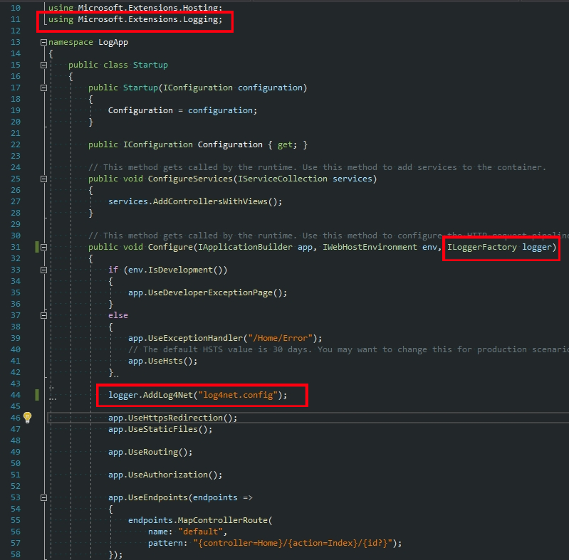 Configure 메서드에서 ILoggerFactory 를 인자로 넘겨주고 AddLog4Net()모듈을 사용