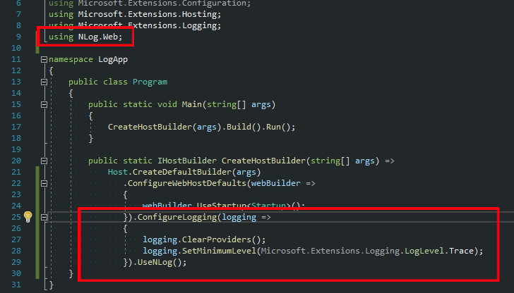 CreateHostBuilder 에서 파이프라인을 통해 ConfigureLogging 을 추가하고 UseNLog를 사용하도록 하면 nLog 에 대한 설정은 완료가 된다.