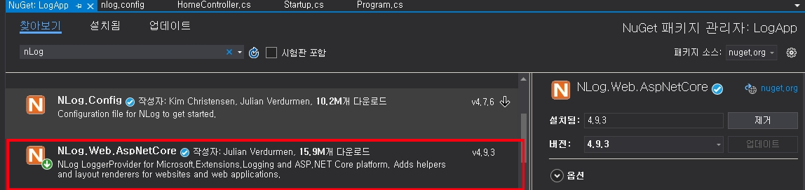 nLog 패키지 모듈 설치 (NLog.Web.AspNetCore)