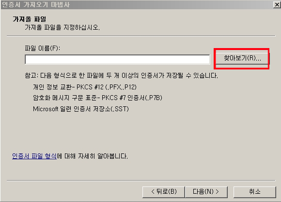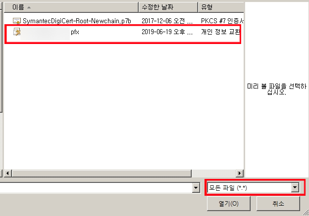 4-3) 모든파일 찾기로 변경 후 인증서 파일(pfx) 선택