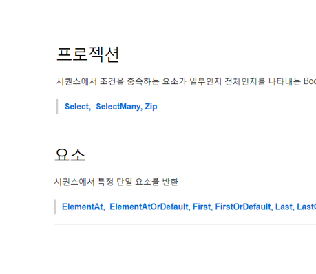 컬렉션 작업을 할때 가장 많이 이용하는 함수이기도 한 프로젝션과 요소작업 컬렉션 메소드에 대해 알아봅니다. 메서드 메서드 이름 설명 C# 쿼리 식 구문 Select 변환 함수를 기반으로 하는 값을 프로젝션합니다. select SelectMany 변환 함수를 기반으로 하는 값의 시퀀스를 프로젝션한 다음 하나의 시퀀스로 평면화합니다. 여러 from 절 사용 Zip 지정된 2~3개 시퀀스의 요소를 사용하여 튜플 시퀀스를 생성합니다. ElementAt 컬렉션의 지정된 인덱스에 있는 요소를 반환합니다. ElementAtOrDefault 컬렉션의 지정된 인덱스에 있는 요소를 반환하거나 인덱스가 범위를 벗어나면 기본값을 반환합니다. First 컬렉션의 첫 번째 요소 또는 특정 조건에 맞는 첫 번째 요소를 반환합니다...
